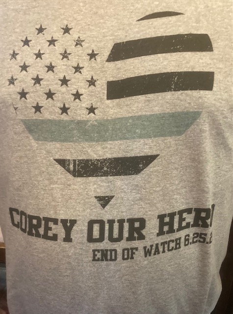 A number of those attending the event wore T-shirts adorned with a heart-shaped flag symbol, along with the sentiment “COREY OUR HERO END OF WATCH 6.25.24.”