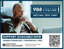 Public Health Educator Kristin Bath provided updates regarding Lincoln County suicide data from 2017 through 2023. There were 40 deaths resulting from suicide through the period, 83% of those were males. Bath shared that the department recently completed a 988-suicide prevention and lifeline campaign in June targeting middle aged/older men. The Health Department is continuing the campaign and expanding the target group to men ages 30 and over. A resource packet including magnets and other materials will be mailed out to clinics, worksites, churches, first responders, and veterans groups.