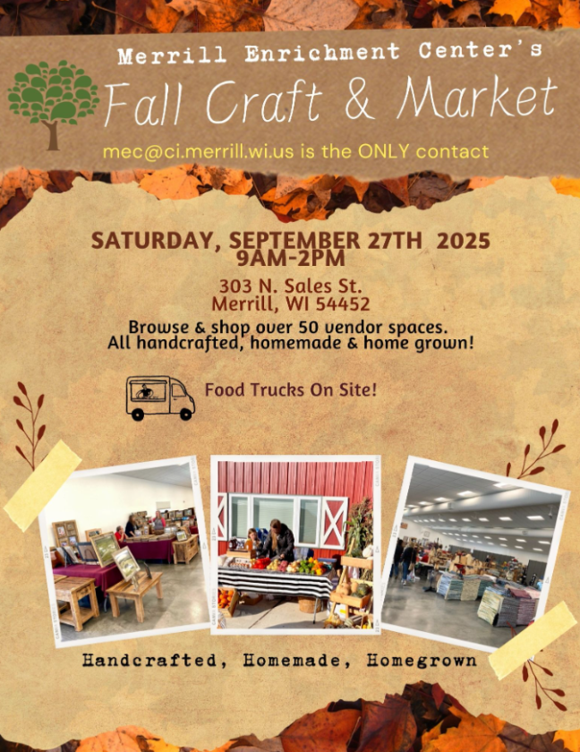 MERRILL – The Merrill Enrichment Center’s Fall Craft Market will take place this Saturday from 9 am until 2 pm. More than 50 vendors will be at the market displaying local handcrafted, homemade & homegrown crafts, and a number of food trucks will also be on site.