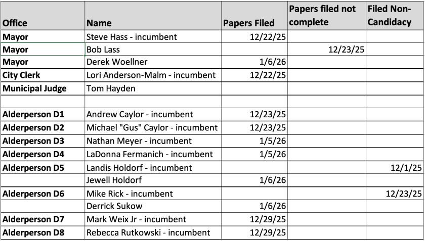 Tom Hayden will run unopposed for the Municipal Judge seat, and incumbent Lori Anderson-Malm is also unopposed for the City Clerk position. In the race for Mayor, Steve Hass will be opposed by Derek Woellner as Hass seeks a second term as the City’s Mayor.